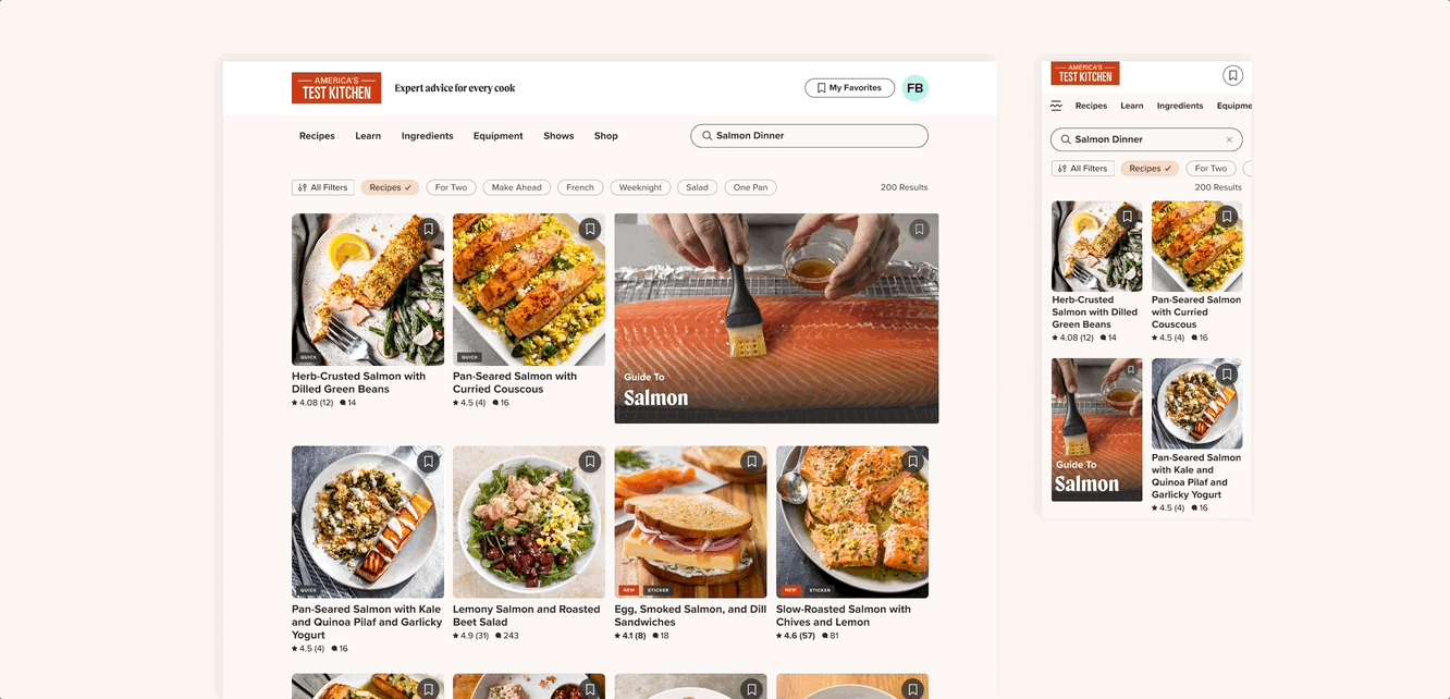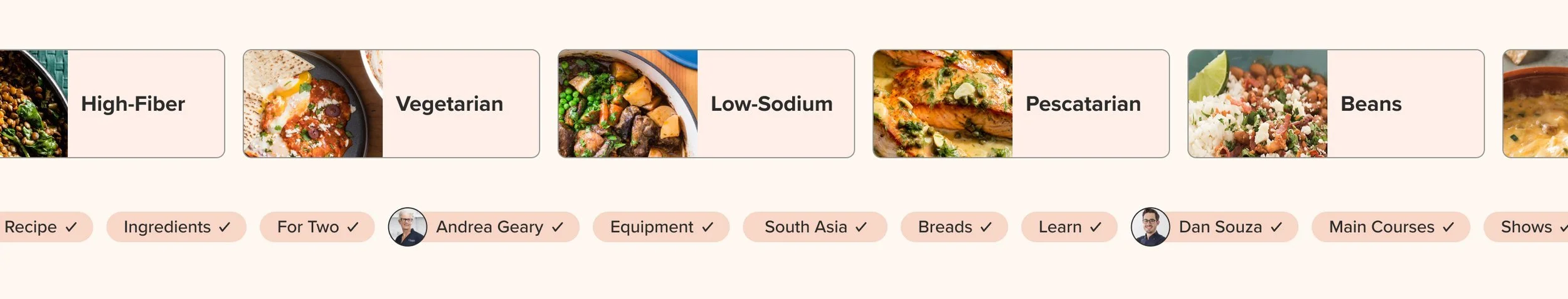 Mega-menus show only high-value and seasonal categories to help home cooks get their bearings without a taxing cognitive load. We gave more TLC to the earlier parts of the search journey, adding a more visual type ahead with recipe previews and a small set of optional filters. In addition to extending the access/visibility of filters, we also tackled their hierarchy– prioritizing customer-centric filters like ‘gluten-free’ ‘for two’ ‘make-ahead’ ‘Southeast Asian,’ etc that reflect folks’ searching anchors, rather than internal Test Kitchen categorization.